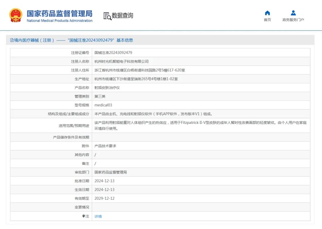 2024年12月,花西子母公司宜格集團旗下杭州時光機智能電子科技有限公司(以下簡稱OGP時光肌)申報的“射頻皮膚治.療儀”,成功獲批了國家三類醫療器械注冊證,注冊證編號:國械注準20243092479。成功獲批醫療器械三類認證意味著OGP時光肌的射頻皮膚治.療儀在產品安.全性和有效性方面通過了國家藥監局權威認證,這一成就無疑為消費者吃下了一顆 “定心丸”,也為整個家用美容儀器行業朝著更加規范化、專.業化的方向發展做了良好表率。